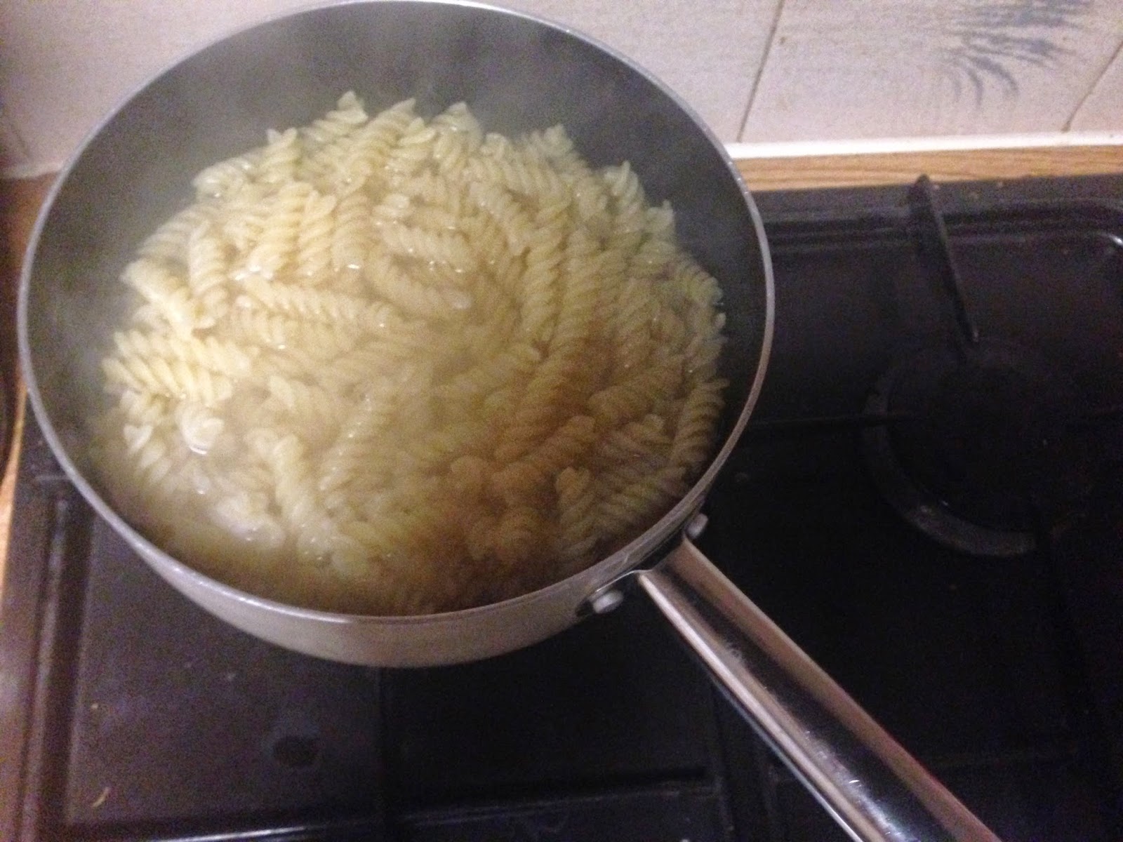 When the pasta is cooked, drain and mix in the sauce and tuna chunks.